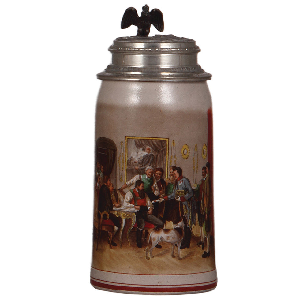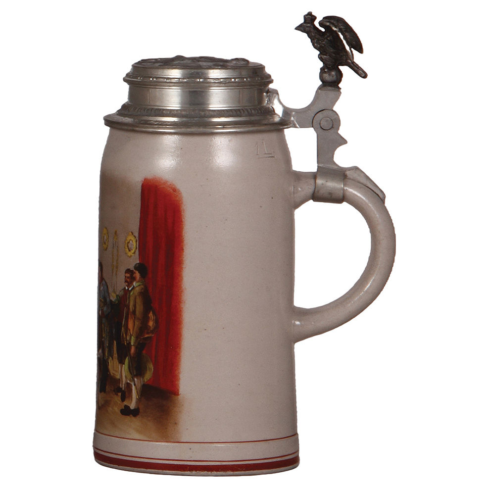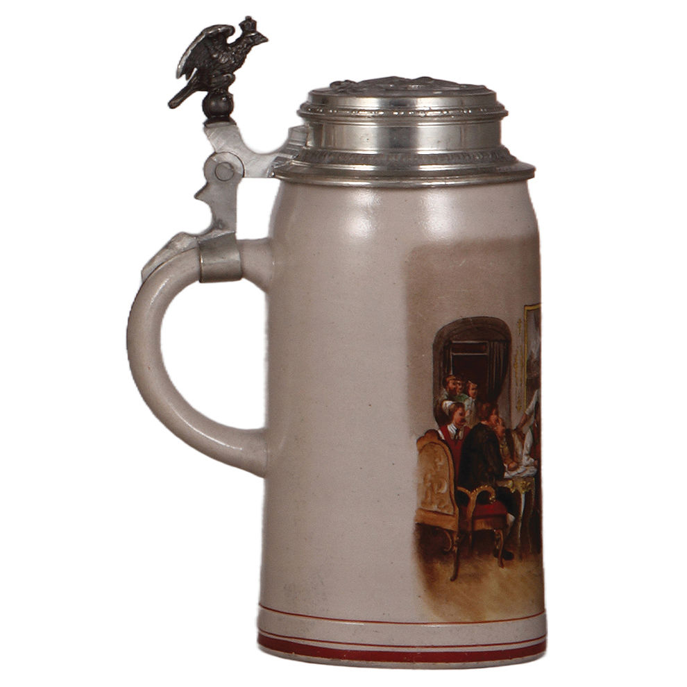 Stoneware stein, 1.0L, transfer & hand-painted, marked R.M., Reinhold Merkelbach, military officer delivering a document, relief pewter lid, mint.