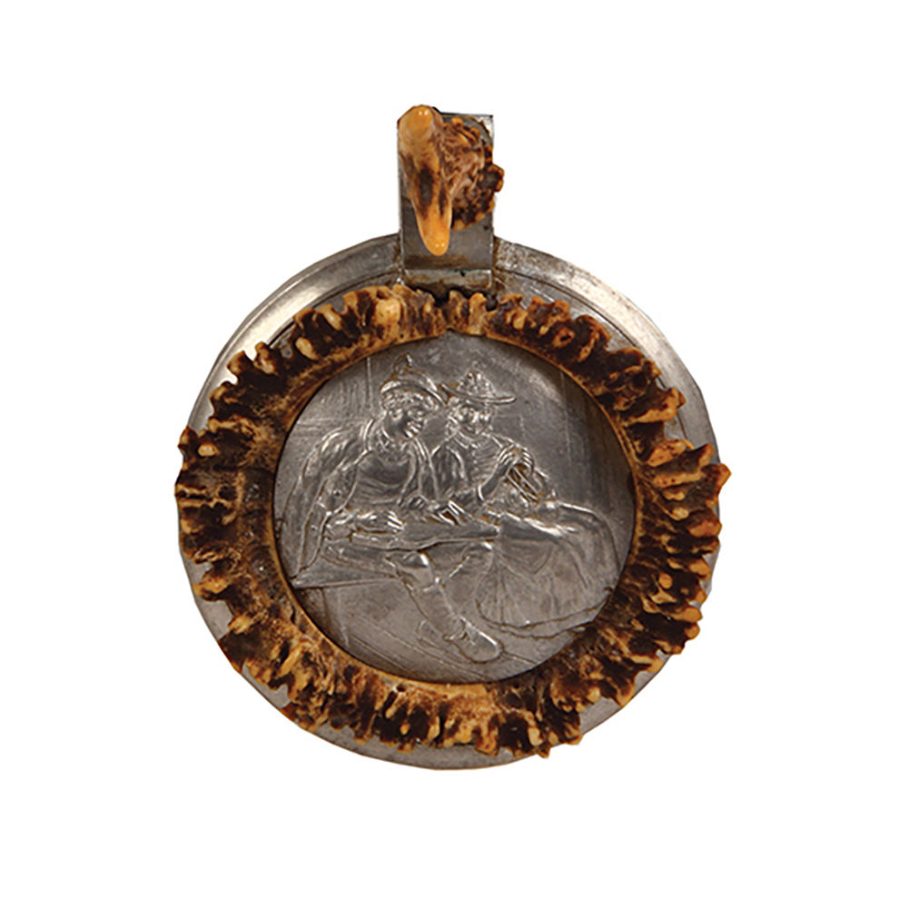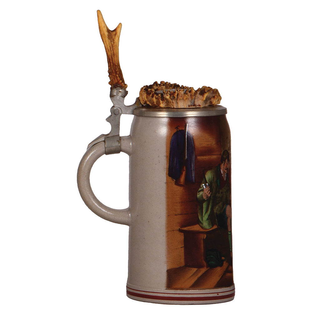 Stoneware stein, 1.0L, transfer & hand-painted, Mittagstisch mit Jäger, pewter lid with antler rosette & pewter inlay, mint.