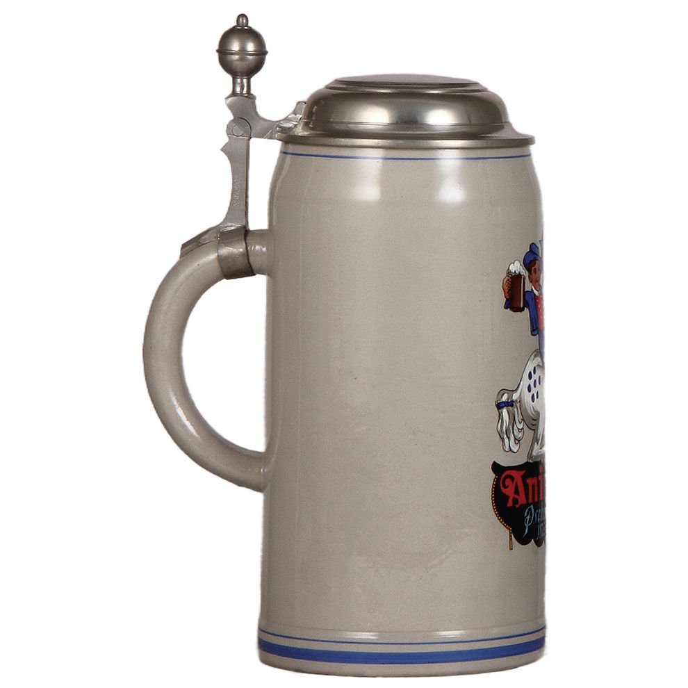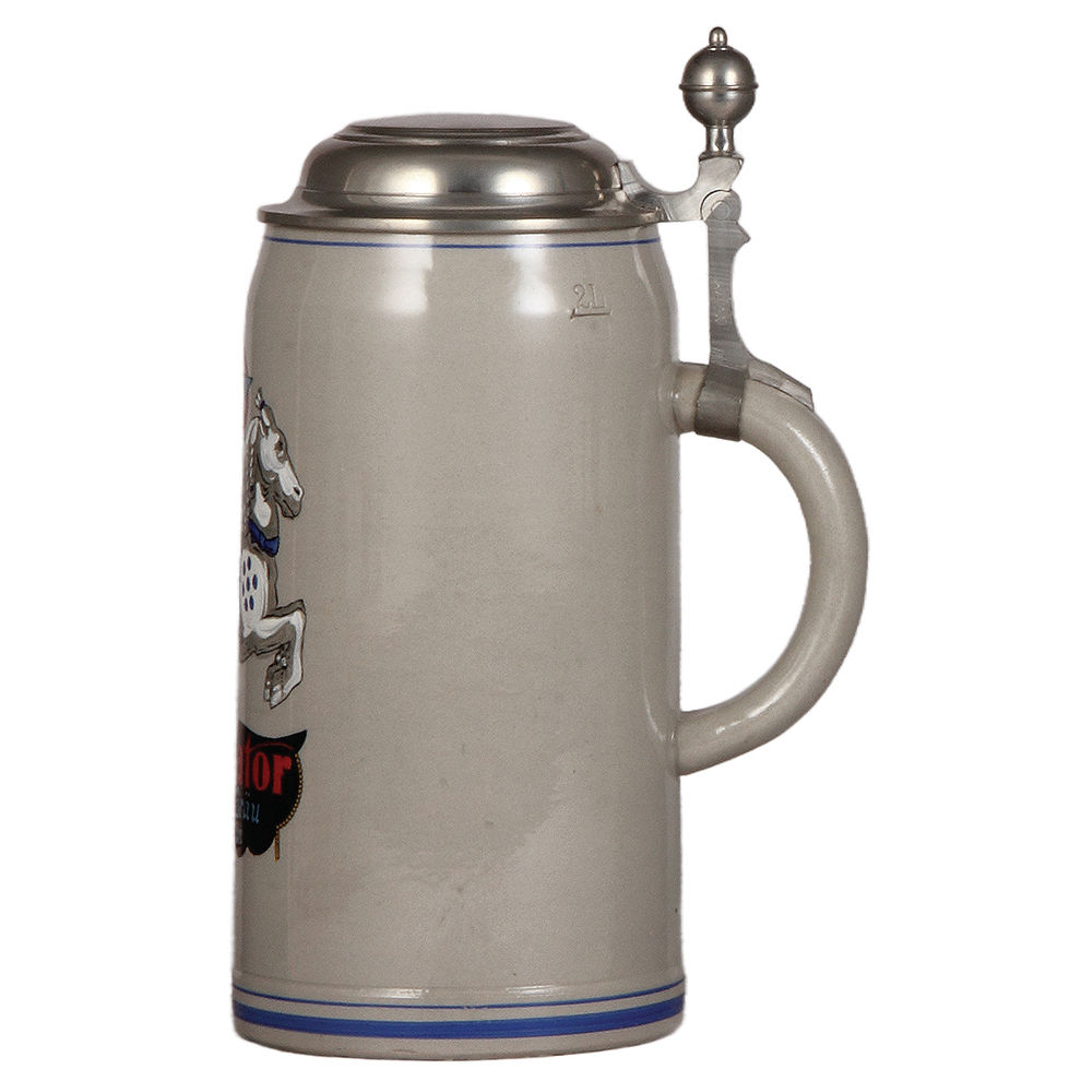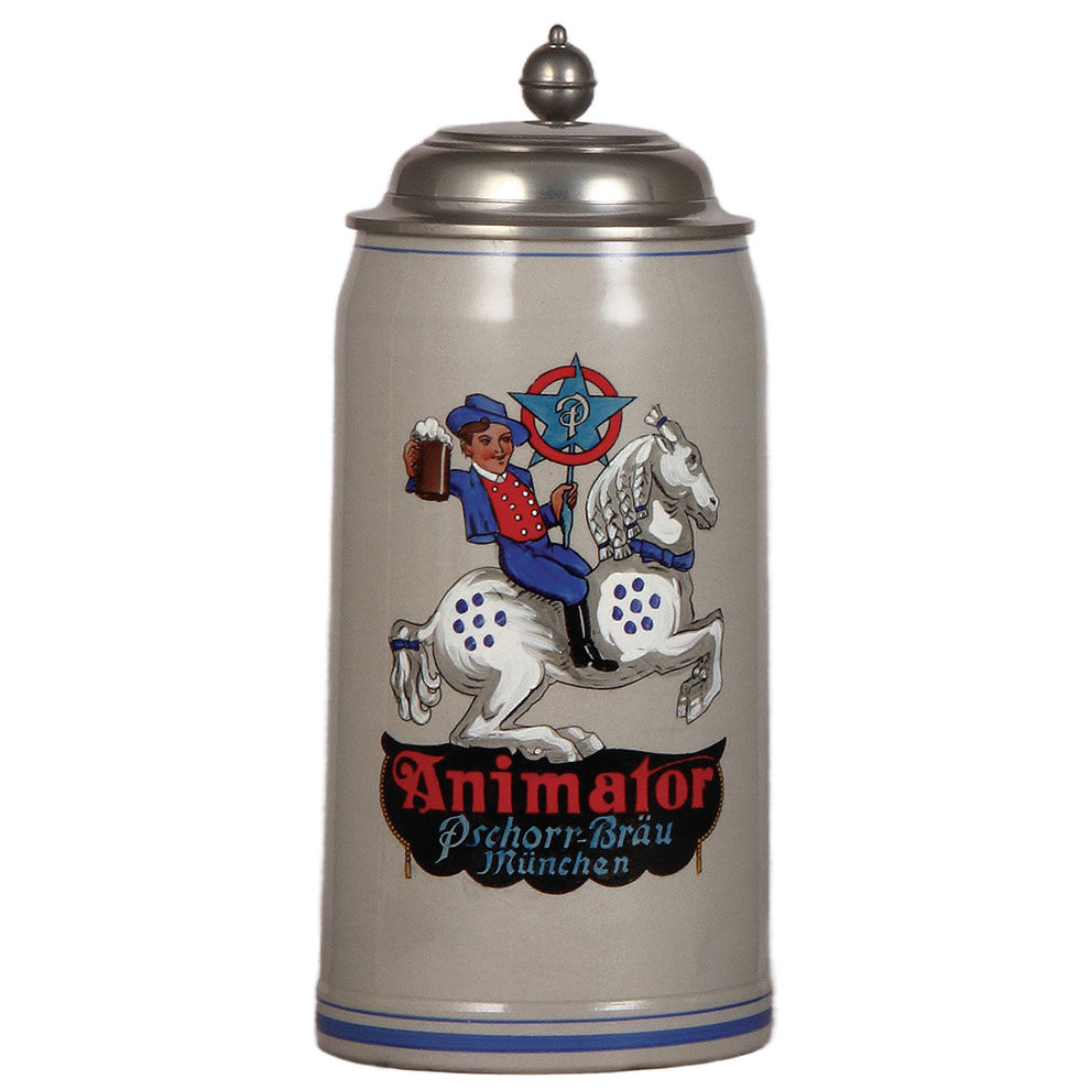 Stoneware stein, 2.0L, 11.5″ ht., transfer, Wick-Werke, Animator Pschorr-Bräu, München, pewter lid marked Mory, München, mint.