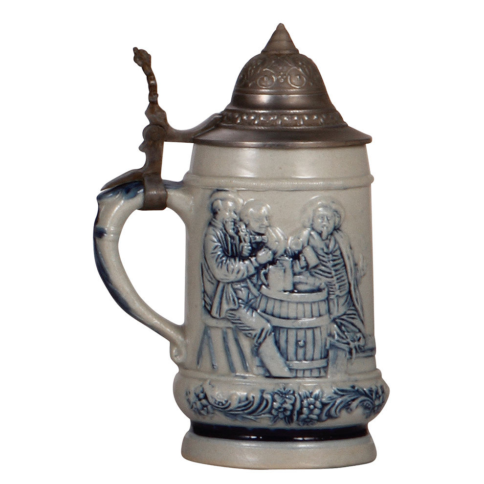 Stoneware stein, .3L, relief, by Whites, Utica, N.Y., marked Whites Pottery, Utica, N.Y., Pan American Exposition, 1901, Buffalo, N.Y., U.S.A., blue salt glaze, pewter lid, small flake on base rim, otherwise mint.