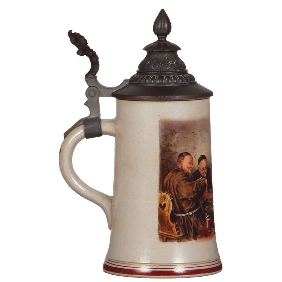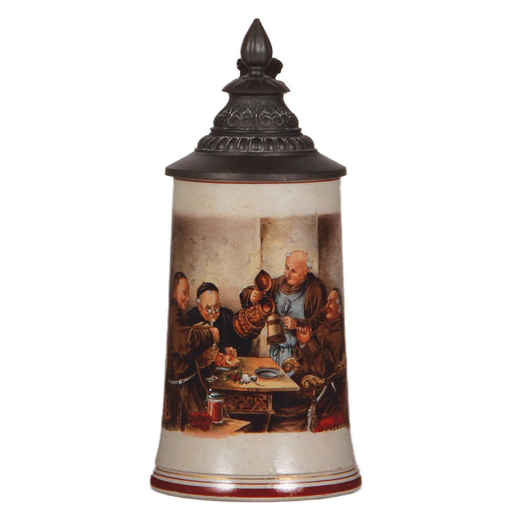 Stoneware stein, .5L, transfer & hand-painted, marked M. & W. Gr., by Martin Pauson München, monks, scene by Ed. v. Grützner, pewter lid marked Pauson München, mint.