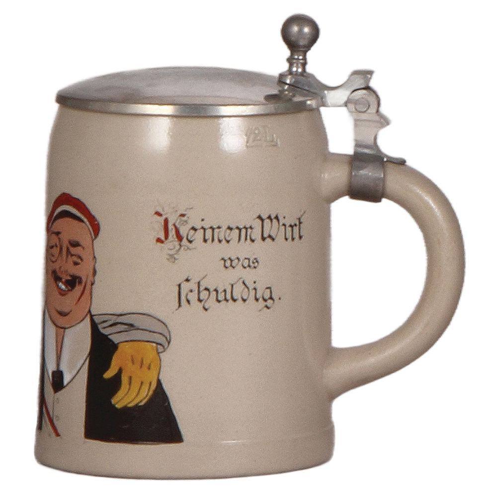 Stoneware stein, .5L, transfer & hand-painted, two students, pewter lid, mint.