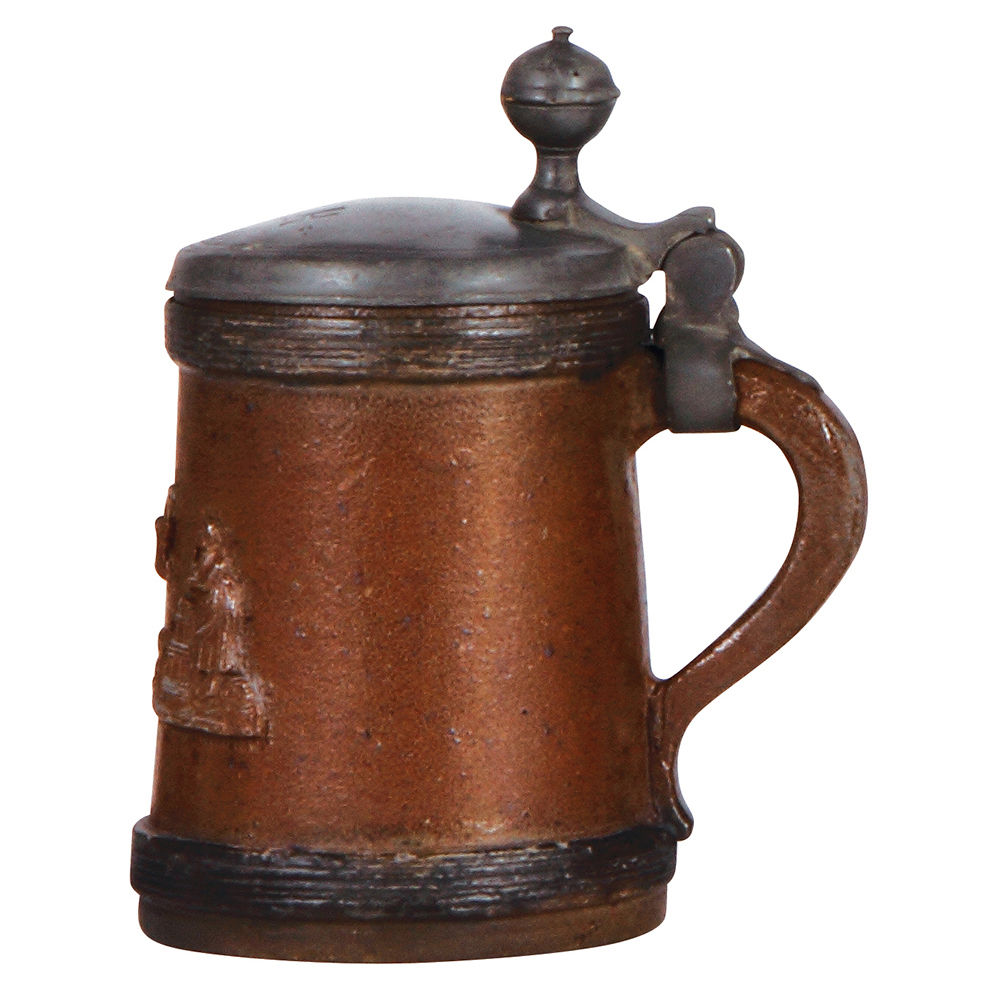 Stoneware stein, 6.8″ ht., early 1800s, Muskauer Walzenkrug, applied relief, pewter lid, excellent pewter repair, otherwise very good condition.