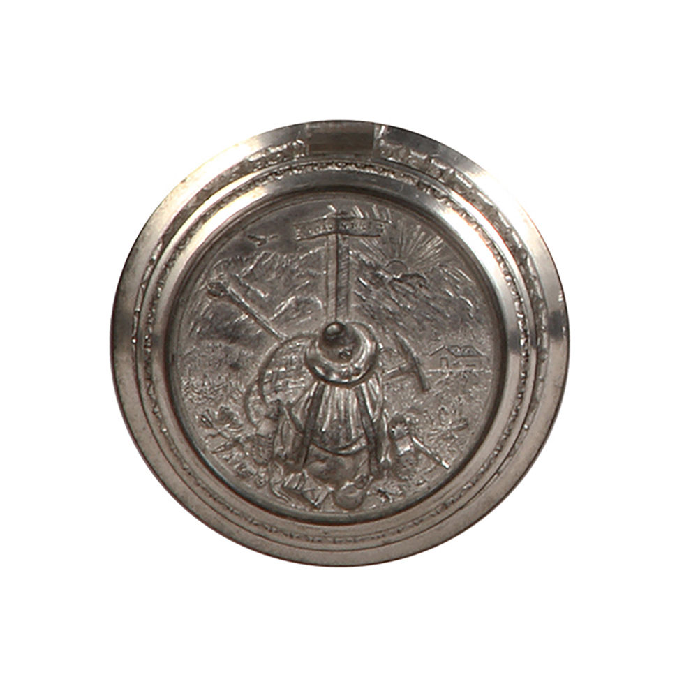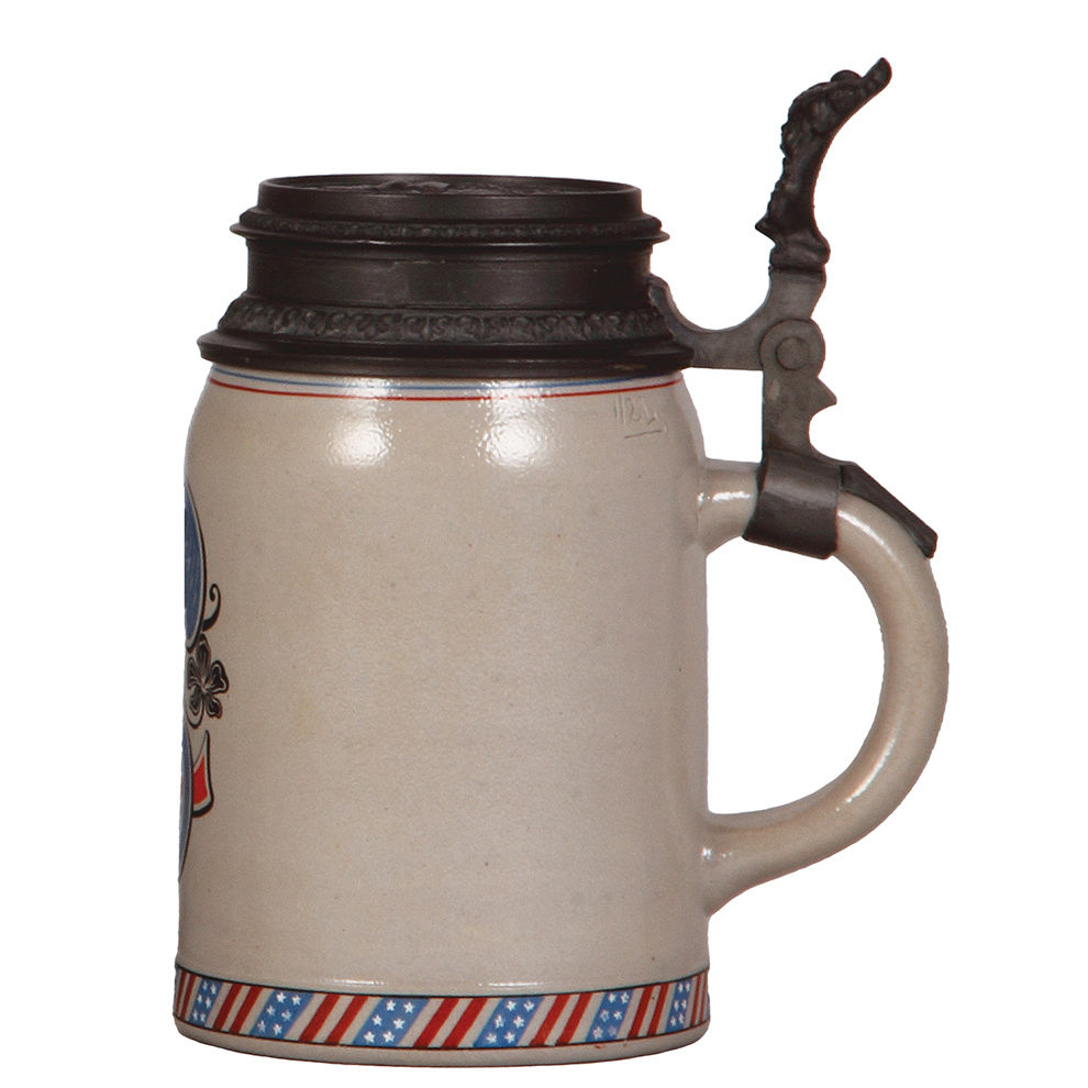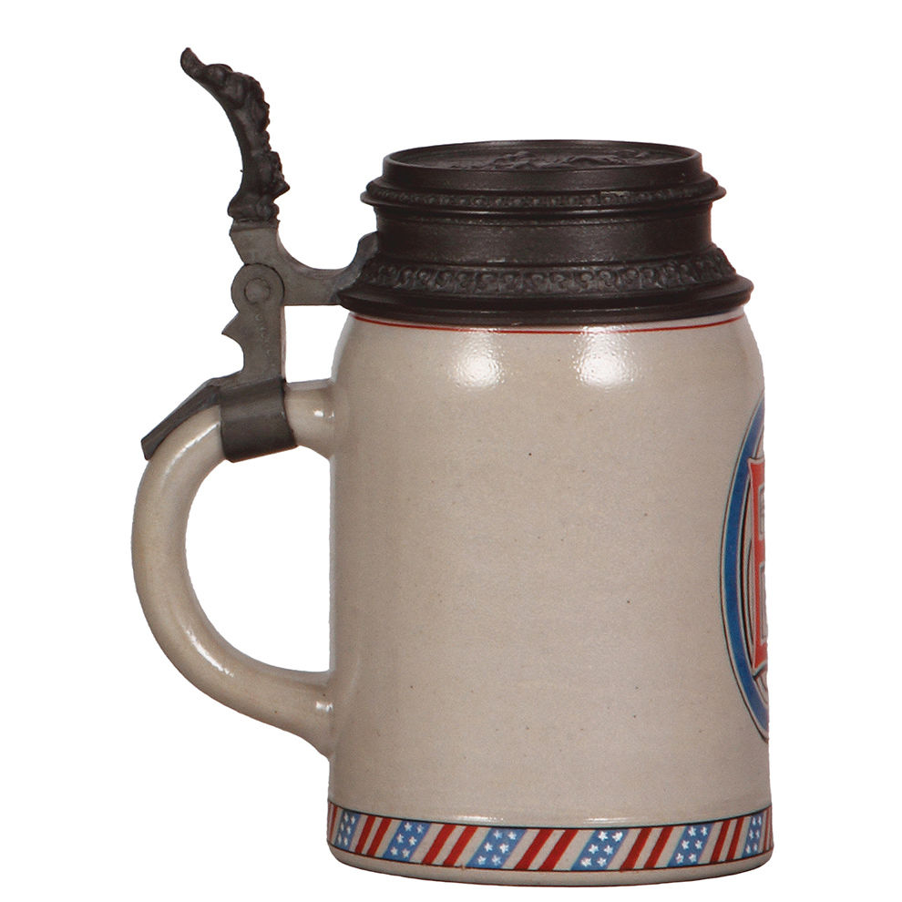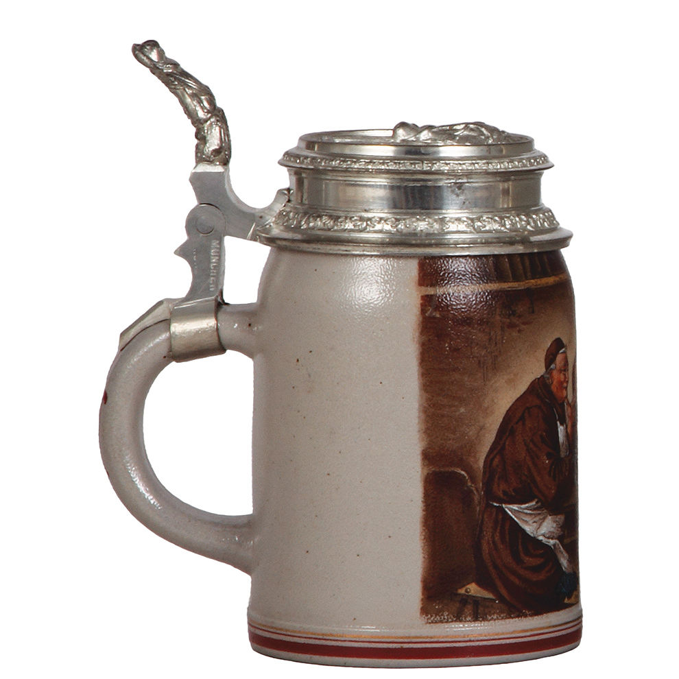 Stoneware steins, two, .5L, transfer & hand-painted, by Martin Pauson, München, monks drinking motif, relief pewter lid, mint; with, .5L, by Martin Pauson, München, hand-painted, C.E., relief pewter lid: Falstaff, mint
