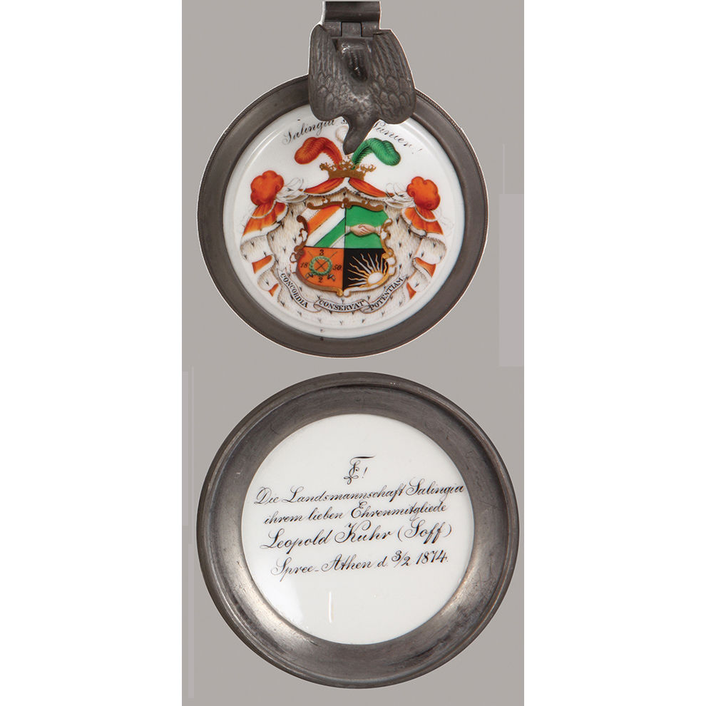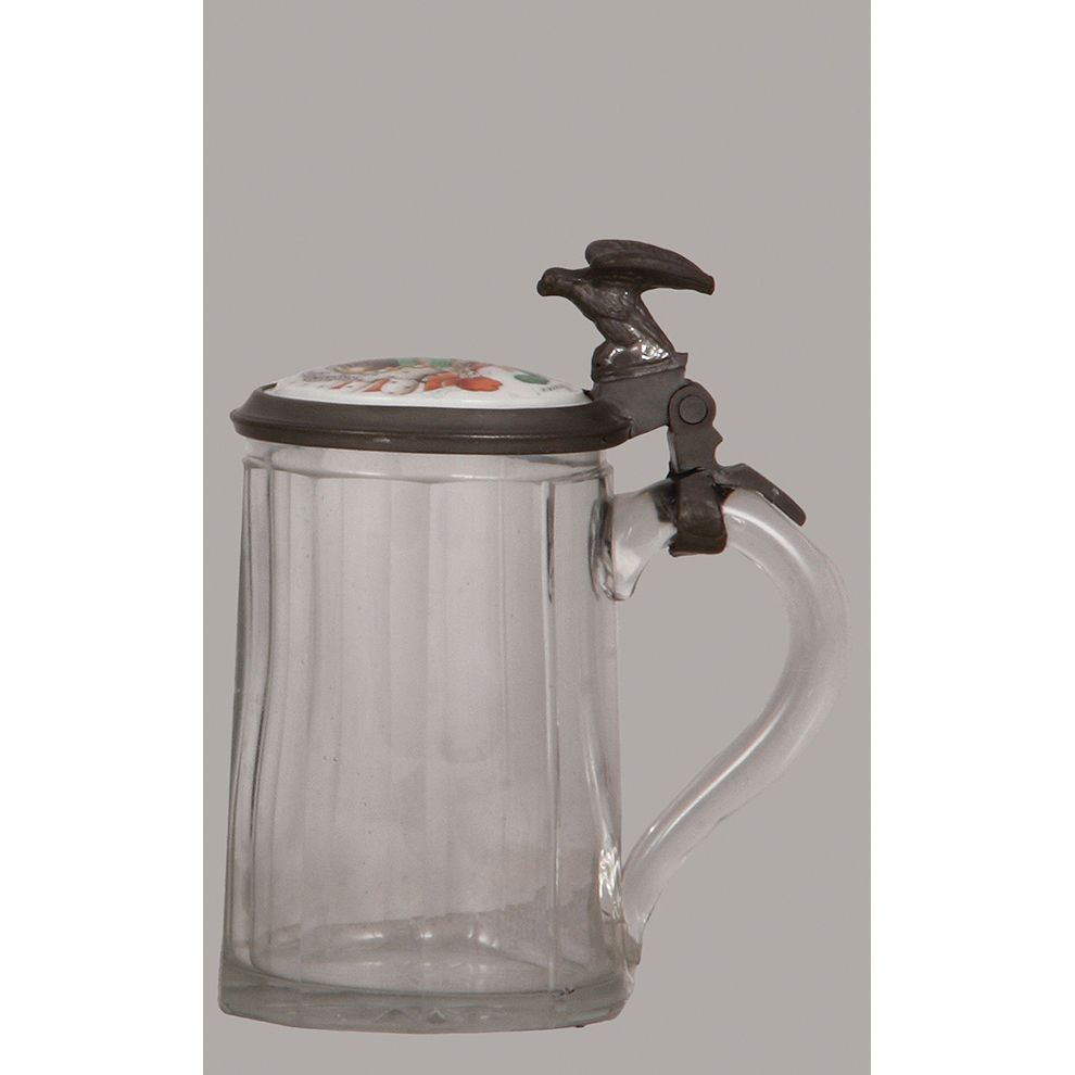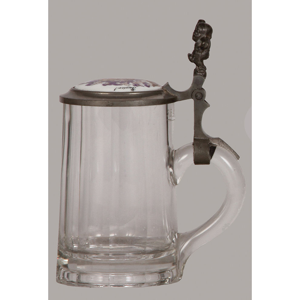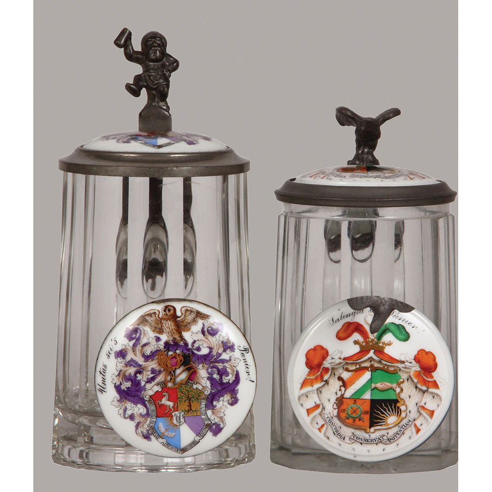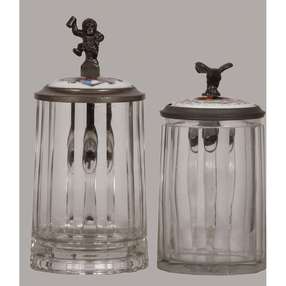 Student steins (two), glass, .5L, blown, cut, faceted, porcelain inlaid lid: student society, Unitas, Hannover, 1889 – 1890, small chips on bottom edge; with, .4L, blown, cut, faceted, porcelain inlaid lid: student society, Salingia, Berlin, 1874, flake on base, line on bottom of handle.