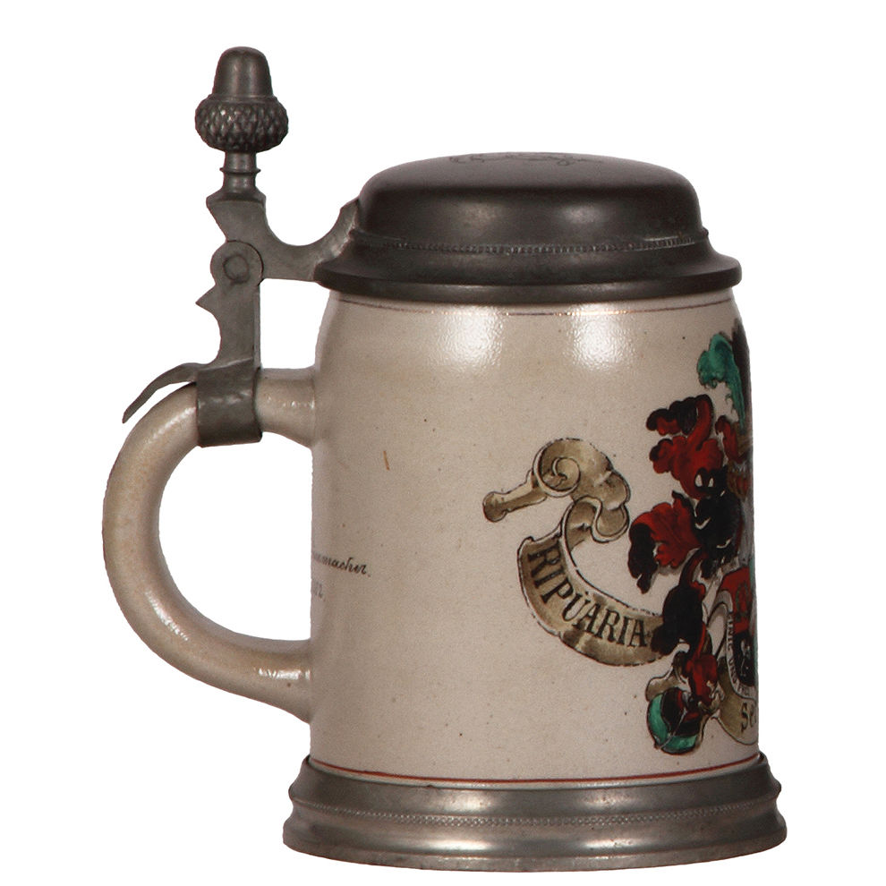Student steins (two), stoneware, .5L, transfer & hand-painted, student society, Ripüaria sei’s Panier!, 1902, pewter lid, small chip on upper rim; with, .5L, transfer & hand-painted, student society, unidentified group, c.1900, pewter lid, mint.