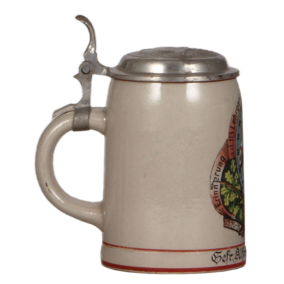 Third Reich stein, .5L, stoneware, a.d. 113. Lehrgang d. Heeres Lehrschmiede, München, v. 1.11. – 31.12, 1940, owner’s name, relief pewter lid with helmet with swastika, mint.
