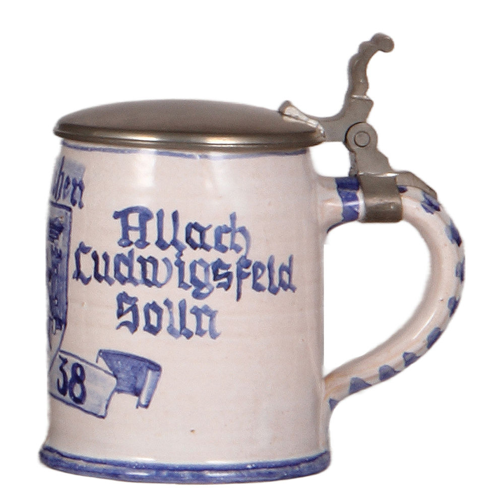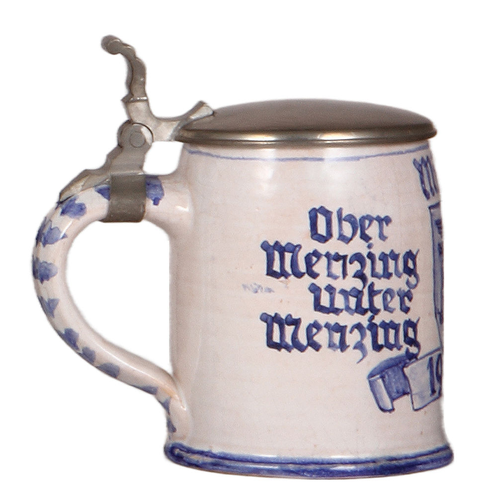 Third Reich stein, .5L, pottery, München, 1938, cities incorporated into München, pewter lid, mint.