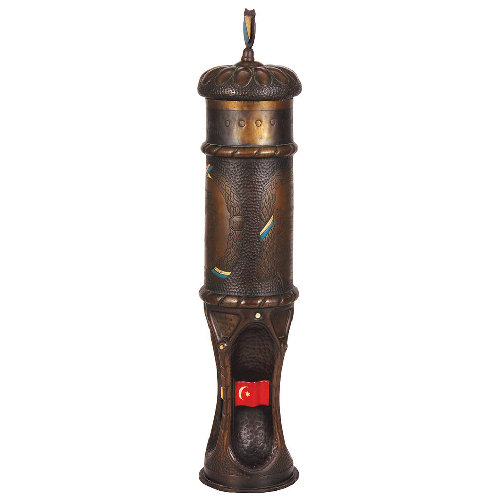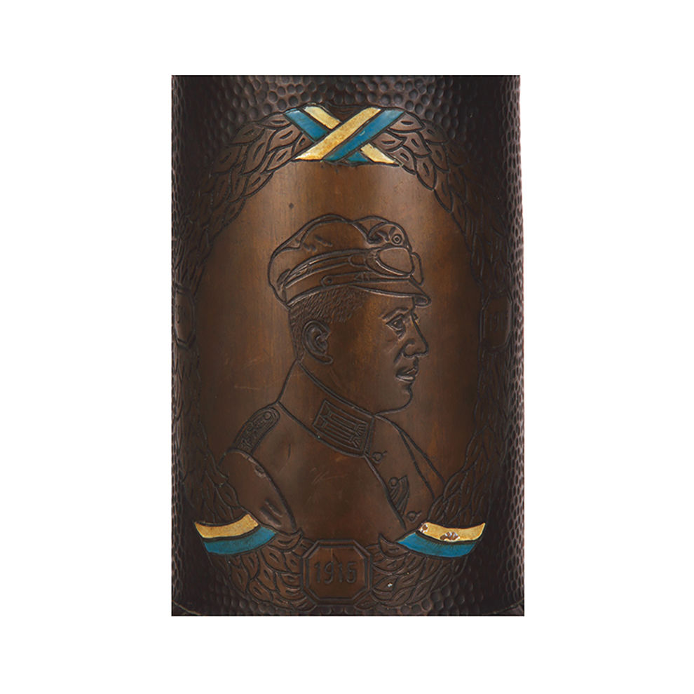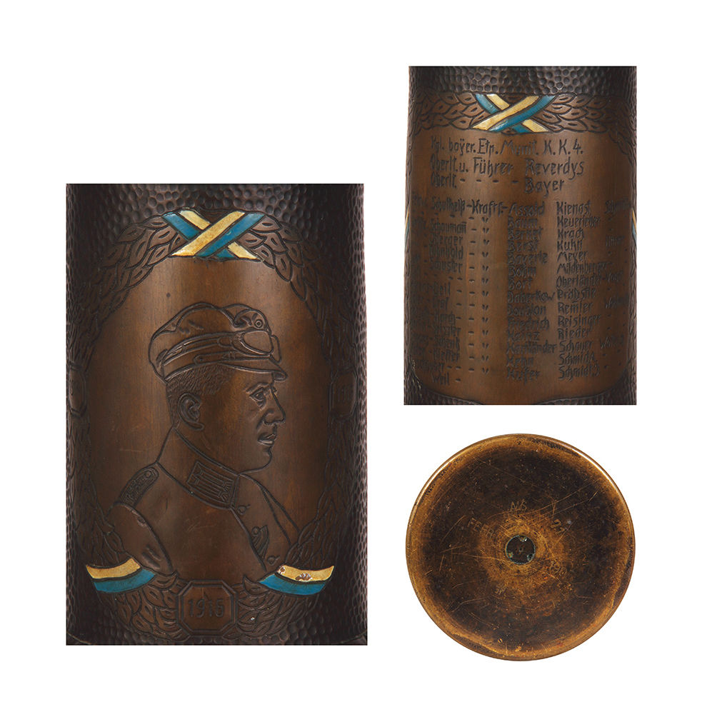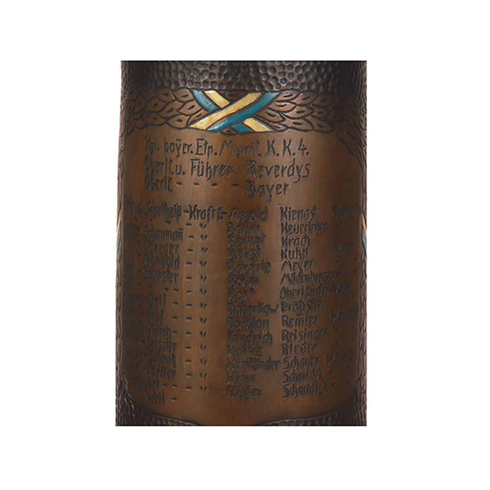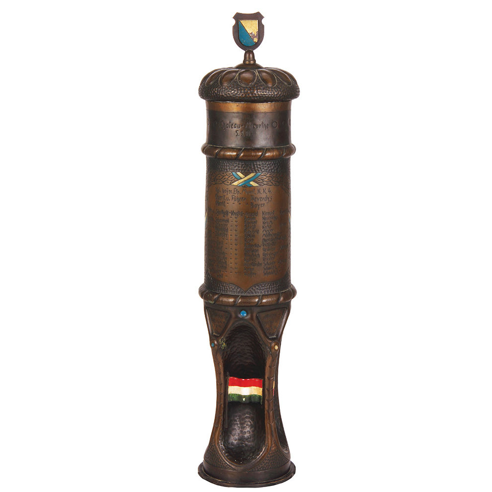 Trench Art pokal, 23.5″ ht., made from an artillery shell, Chateau Meurthe 5.9.14, Chateau Mametz 25.9 – 30.10.14, additional battles listed, engraved Kraftfahr driver dated 1916, Kgl. bay. Etp. Munit. K. K. 4., roster, enameled flags, unusual and rare size minor enamel flakes, otherwise very good condition.